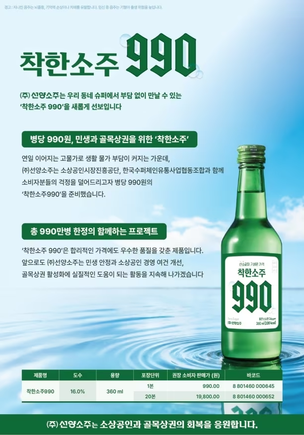 이번 협약에 따라 이날부터 전국 약 1만 개 동네 슈퍼마켓에 총 990만 병의 ‘착한소주’가 공급된다. 소비자가격은 단돈 990원으로 책정됐다.
