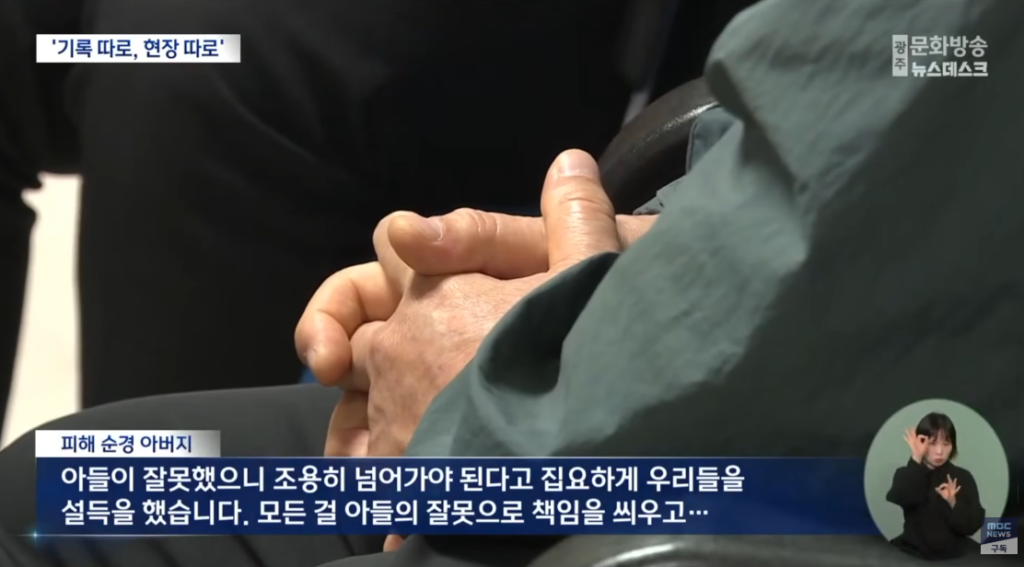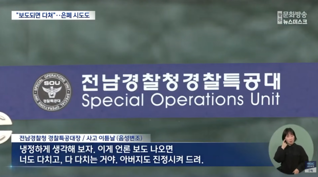 여기에 조직적인 은폐 정황까지 드러났다. 사고 다음 날인 21일, 전남경찰청 경찰특공대장이 피해 순경에게 “언론 보도가 나가면 너도 다치고 다 다친다. 아버지도 진정시켜 드려라”라며 사건 무마를 시도한 정황이 담긴 녹취가 공개된 것이다.